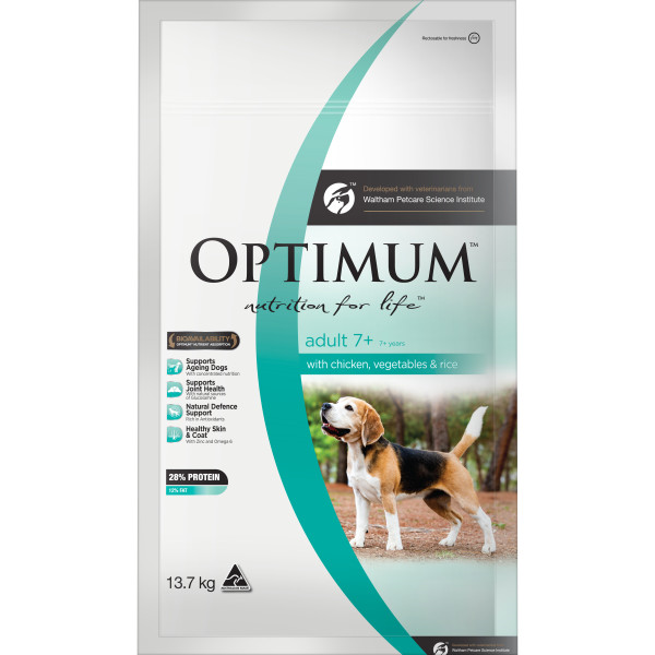 Optimum Adult 7+ with Chicken, Vegetables and Rice Optimum pet food is made in Australia and contains no artificial colours or flavours. Optimum Adult 7+ with Chicken, Vegetables and Rice is a complete balanced and nutritionally complete dry food diet for mature dogs - over the age of 7 for small to medium breeds, and over the age of 6 for large to giant breeds. This diet has been formulated with a natural source of glucosamine for joint health, higher protein, and concentrated vitamin and mineral levels to help support the health and immunity of older dogs. Dental health is also important as dogs begin to age. The mechanical action of chewing the crunchy dry kibble, in combination with the active ingredient (sodium tripolyphosphate) also helps promote good oral hygiene.