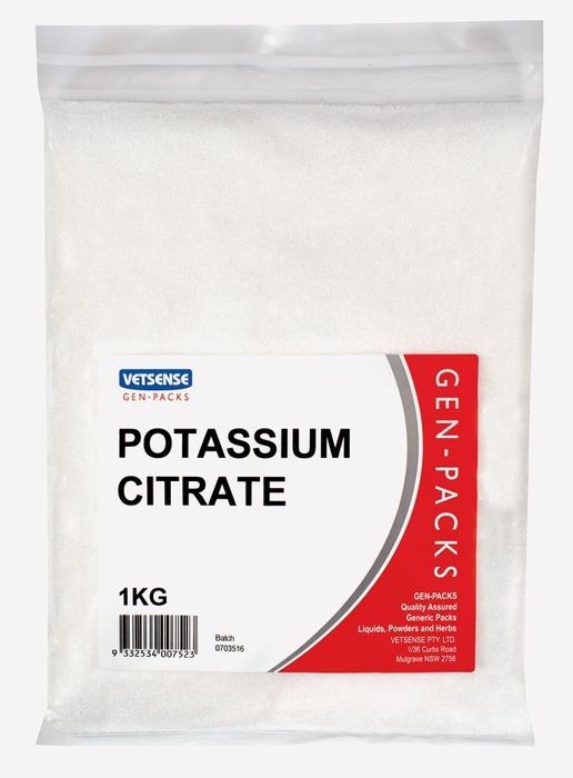 Vetsense Gen-Pack Potassium Citrate 1kg Vetsense Gen Packs Re-Packaged Raw Materials Are Supplied For General Use Only And Do Not Come With Dosage Or Administration Instructions. Please Consult Your Veterinarian Or Animal Health Specialist For Advice Specific To Your Needs.