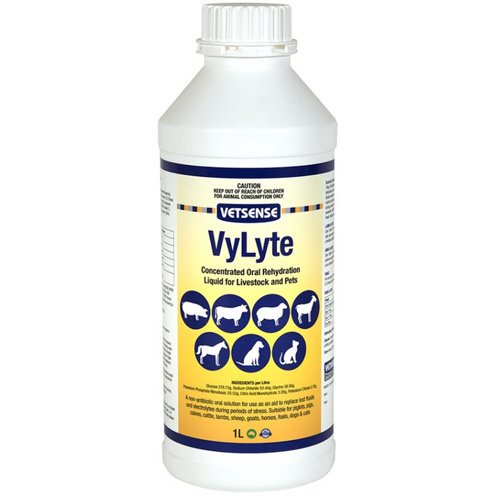VyLyte is a non-antibiotic oral solution for use as an aid to replace lost fluids and electrolytes during periods of stress. Suitable for piglets, pigs, calves, cattle, lambs, sheep, goats, horses, foals, dogs & cats
