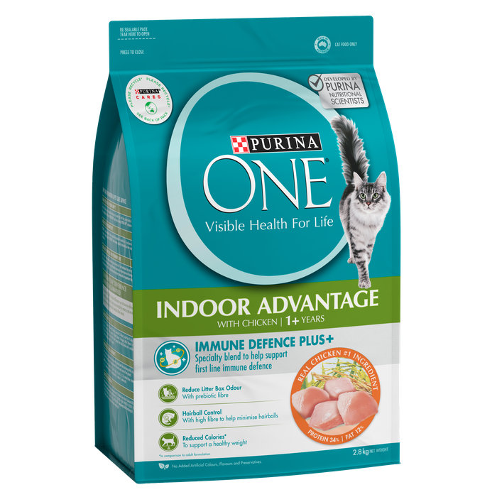 PURINA ONE® INDOOR ADVANTAGE with IMMUNE DEFENCE PLUS+ has been specially formulated with beta glucans, vitamin C & E and omega 3 & 6 fatty acids. Working in parallel this blend helps support first line immune defence for your cat: • Vitamin E & C are natural antioxidants that help prevent cell damage associated with aging and poor health • Omega 3 & 6 fatty acids helps keep skin healthy to maintain a strong barrier to the external environment • Beta glucans to help support optimal immune response. PURINA ONE® Adult Indoor Advantage Dry Cat Food with Chicken contains prebiotic fibre to help reduce faecal aroma by promoting balanced gut flora. Reduced calorie diet helps promote a healthy weight for your cat.