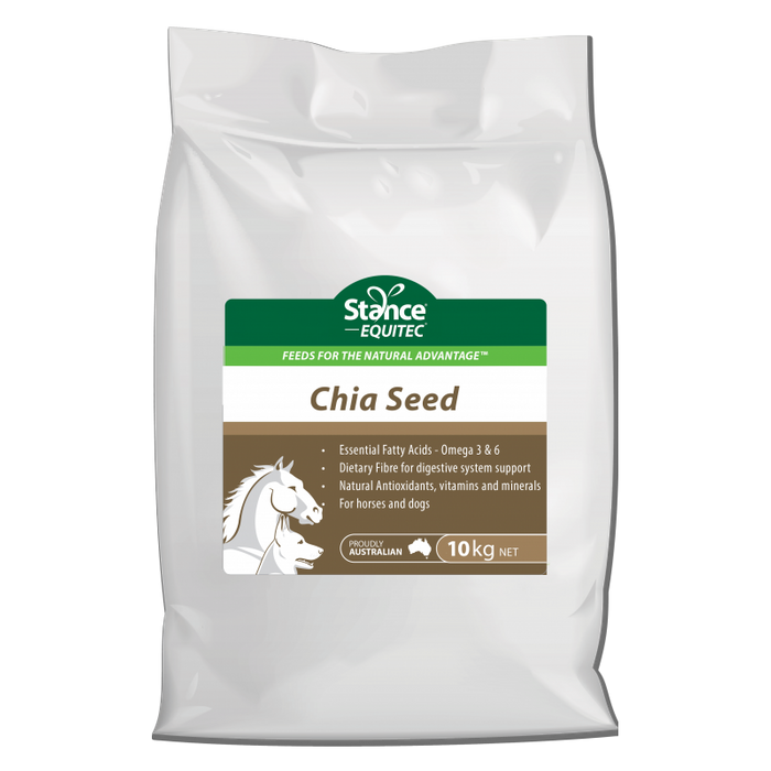 What are Chia Seeds? Chia Seeds are derived from Salvia hispanica, a member of the mint family. They are approximately 1 millimeter in length and black or white in colour. Nutritionally both are very similar. This super food is nutrient dense supplying fibre (42%), vitamins, minerals, and are high in essential fatty acids omega-3 and omega-6 at a high favourable ratio of 3:1. It is a source of cool calories with digestible energy. It contains mucilage, a water-soluble fibre, that holds up to 27 times it’s own weight in water. When water is added the seeds become coated in a gel. This gel adds bulk to the hindgut which may help prevent sand colic. The mucilage along with quercetin, a biologically active flavonoid, help protect and heal the mucosal lining throughout the stomach and gastrointestinal tract. Other nutraceutical benefits Chia seeds provide include weight management, joint and muscle support from the omega-3, skin and allergy support, and a healthy immune response due to the high omega-3 ALA content. The high soluble fibre content slows the absorption of glucose helping modulate insulin spikes and other metabolic conditions making it safe for all horses. Hooves and hair benefit from the high-quality protein. Essential Fatty Acids – Omega-3 and 6 Dietary Fibre for digestive system support Natural Antioxidants, vitamins and minerals May support gut mobility