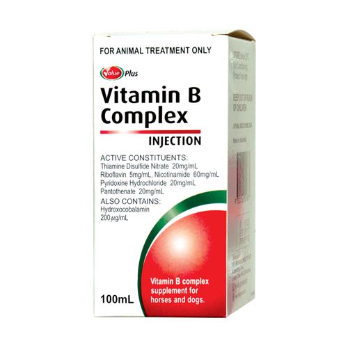 Value Plus Vitamin B Complex Injection is a B group vitamin supplement for horses and dogs containing vitamins B1, B2, B3, B5, B6 and B12. Each ml contains: Thiamine Disulfide Nitrate 20mg Riboflavine 5mg Nicotinamide 60mg Pyridoxine Hydrochloride 20mg Pantothenate 20mg Hydroxocobalamin 200 ?g Administer by intramuscular injection twice weekly or as directed by a veterinary surgeon.