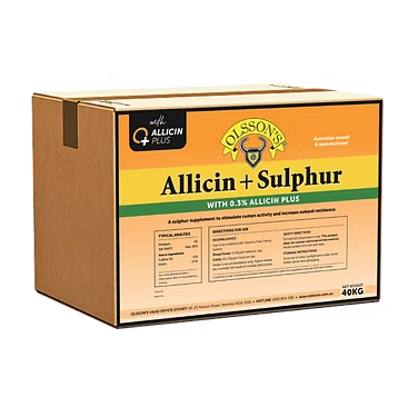 ALLICIN PLUS SULPHUR Olsson’s Allicin + Sulphur helps reduce fly, tick and lice burden. It also provides sulphur & nutrients to encourage optimal microbial growth & ammonia balance. Allicin + Sulphur provides an effective, natural and ongoing solution to fly, tick and lice burden. In trials, our formulation has reduced the burden to less than 100 flies per animal (the threshold to drench). For cattle, sheep, horses & goats. Patent pending. How Allicin works video: https://youtu.be/F_IhOA8XDkU?si=S55cSY9YVvv8YlhA For optimal health & performance, use in conjunction with Olsson’s Free Choice System. Available in 40, 100 & 125kg blocks. Olsson's supports local business and as such we sell our products through local rural agents. To purchase our blocks check out your local stockist for pricing and availability.