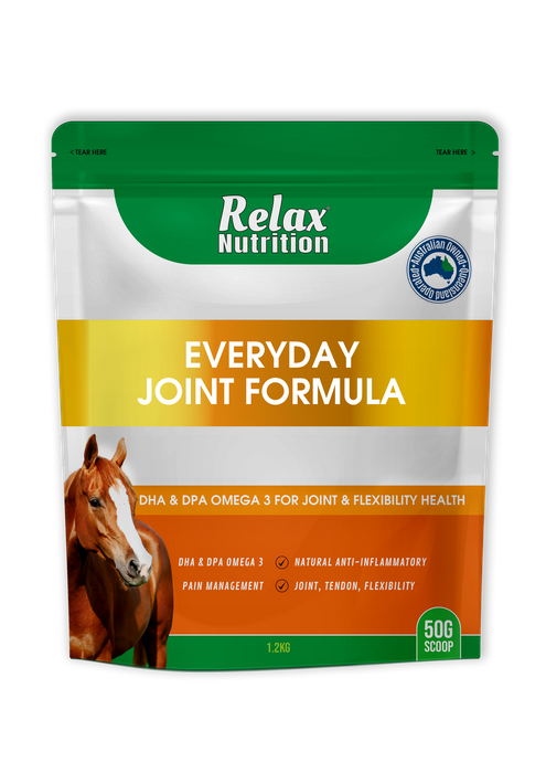 Relax Everyday Joint Formula is a natural, plant-based supplement developed to promote flexibility, reduce stiffness, and support long-term joint health in horses. Using a carefully selected blend of effective ingredients, this formula delivers daily support to help your horse move freely, comfortably, and confidently. Developed with plant-based DHA and DPA—the equivalent to fish oil Omega-3s—it supports joint lubrication and inflammation reduction without relying on animal-derived ingredients. These powerful fatty acids work in synergy with organic high-curcumin turmeric and rosehip, which provide natural anti-inflammatory and antioxidant properties to aid joint tissue regeneration and protect against oxidative stress. Enhanced with MSM and Vitamin C to support connective tissue repair and immune health, and stabilised linseed meal for essential nutrients and overall mobility, this filler-free formula is suitable for horses of all ages and workloads. Whether for prevention or daily management, Relax Everyday Joint Formula offers natural, plant-based comfort—every day. Key Benefits: Carefully selected blend of effective, plant-based ingredients Plant-based DHA and DPA – the equivalent to fish oil Omega-3s Organic Turmeric and Rosehip for joint regeneration and antioxidant protection MSM and Vitamin C to support tissue repair and immune function 100% natural, plant-based, and filler free