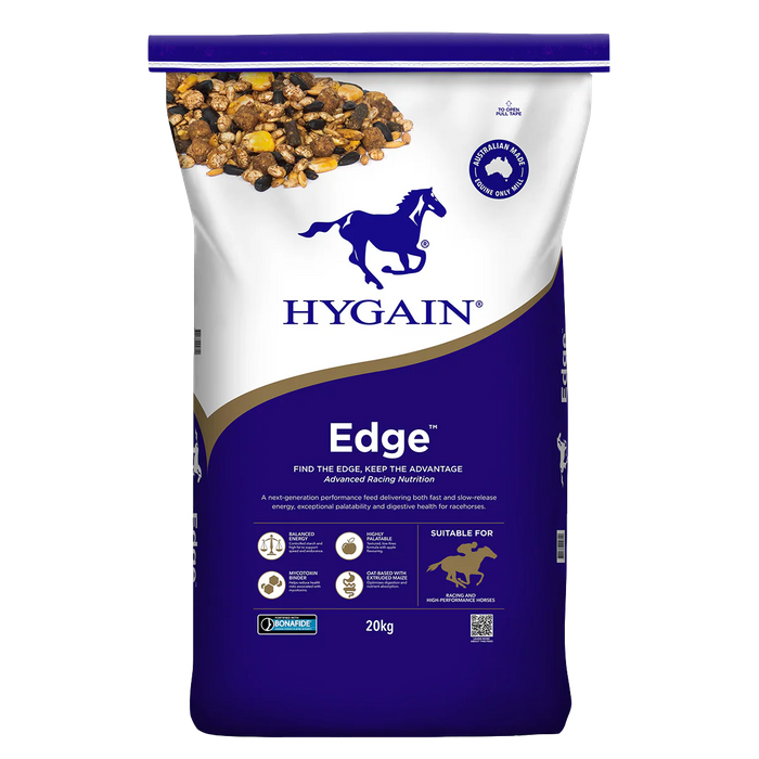 Hygain Edge® HygainSKU: 20kg Find the Edge. Keep the Advantage. Advanced Racing Nutrition. A next-generation performance feed delivering both fast and slow-release energy, exceptional palatability and digestive health for racehorses. Formulation Highlights: DIGESTIVE HEALTH: Hygain Edge® supports digestion and performance with high fat to reduce starch load and preserve glycogen, controlled starch to protect the hindgut and added prebiotics and probiotics for microbiome and immune support. ENERGY FOR PERFORMANCE: A precise balance of protein, fat, fibre and starch fuels sustained effort, aids recovery and reduces metabolic stress during intense work. RACING NUTRIENT PROFILE:Each ingredient is selected for its role in energy metabolism, muscle repair and oxidative stress defence, supporting racehorses in full work. HIGHLY PALATABLE:This muesli-style feed includes a vitamin and mineral pellet to reduce fines and subtle apple flavouring to encourage eating and minimise wastage—critical in racing stables where every feed matters. BONE SUPPORT WITH BONAFIDE®:Contains Quinaquanone® (vitamin K1 & K2) in BONAFIDE® to promote bone density—ideal for stabled horses with limited pasture access. MYCOTOXIN DEFENCE:Includes a broad-spectrum mycotoxin binder to help protect digestive and skin health. Ideal For Thoroughbred and harness trainers seeking performance and simplicity Young horses in pre-training Sprinters and stayers Fillies, colts, and geldings (including those prone to tying-up)