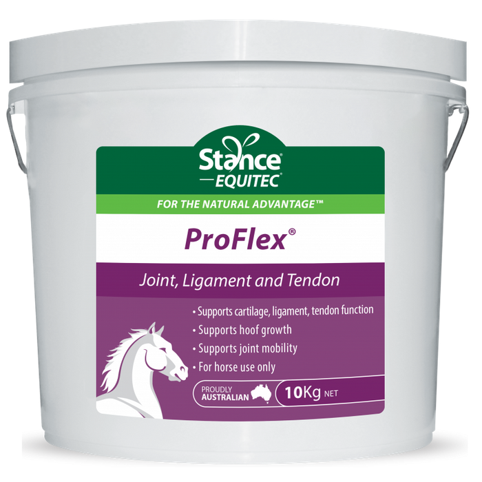 What is ProFlex? ProFlex supports the skeletal, endocrine, nervous and circulatory systems. ProFlex provides the horse with precursors for the natural synthesis of ingredients that support normal joint and function. ProFlex Facts ProFlex is not a quick fix and should be fed over a long period of time. ProFlex is not a drug and is a non toxic feed supplement. About the Ingredients Glucosamine is found in tendons, ligaments, synovial fluid, muscle membranes and several structures in the eye, blood vessels and heart valves. Methlysulphonylmethane (MSM) is a source of sulphur that is converted into an important component of connective tissue. It may have a role in supporting normal osteo, oxidative and anit-inflammatory function. Lysine is an amino acid that when hydroxylated by Vitamin C, is extremely important in the structure of cartilage tissue and protein synthesis. Vitamin C is an essential element for the formulation of the hydroxyl groups needed in cartilage synthesis. Vitamin C deficiency may result in reduced production of collagen - the protein based structure in tendons and ligaments. Zinc is required by over 70 different enzymes to function. In this instance Zinc is used in the hydrolysis and cross linking needed for collagen formation. The Citrus Bioflavenoid Hesperidin may support normal antioxidant function. Gotu Kola is a herb thought to support the integrity of blood vessels and connective tissue.